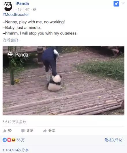 就像所有熊猫宝宝的视频一样,在外网同步发布的时候,只会更受欢迎。比如,这次“奇一”宝宝的视频,在脸书上仅用19个小时就获得了118万次分享、5600万次播放!